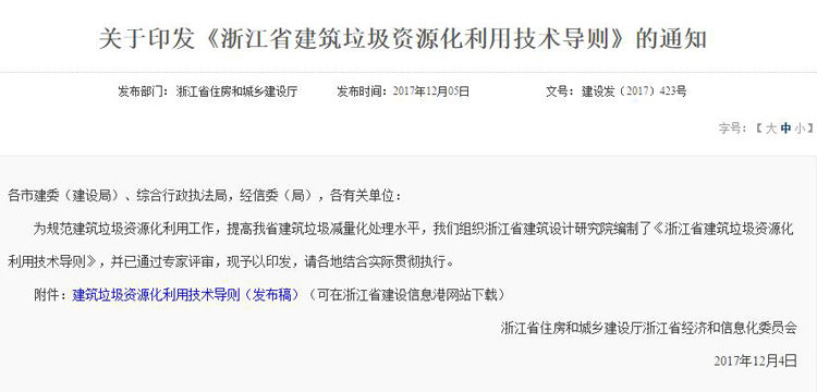 為規(guī)范建筑垃圾資源化利用工作,提高我省建筑垃圾減量化處理水平,我們組織浙江省建筑設計研究院編制了《浙江省建筑垃圾資源化利用技術導則》,并已通過專家評審,現(xiàn)予以印發(fā),請各地結合實際貫徹執(zhí)行。